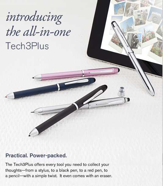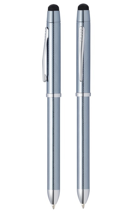 The Cross Tech 3+ features an 8 mm stylus to navigate touch-screens and twist technology allowing you to switch from stylus to black ballpoint pen, to red ballpoint pen and to pencil with one twist. Cross Tech 3+ is available in Metallic Blue, Satin Black, Pearl White, Lustrous Chrome, Satin Chrome and Frosty Pink