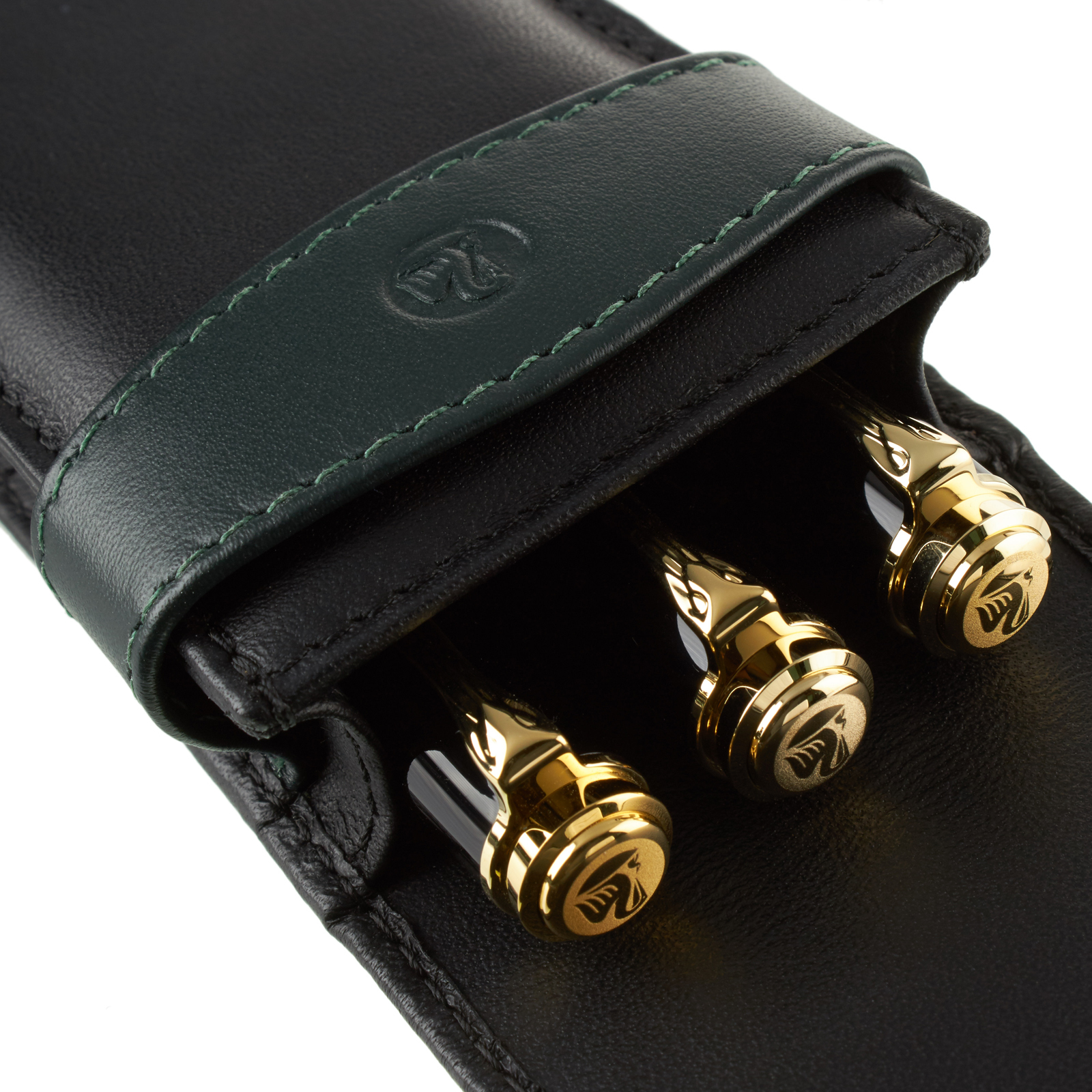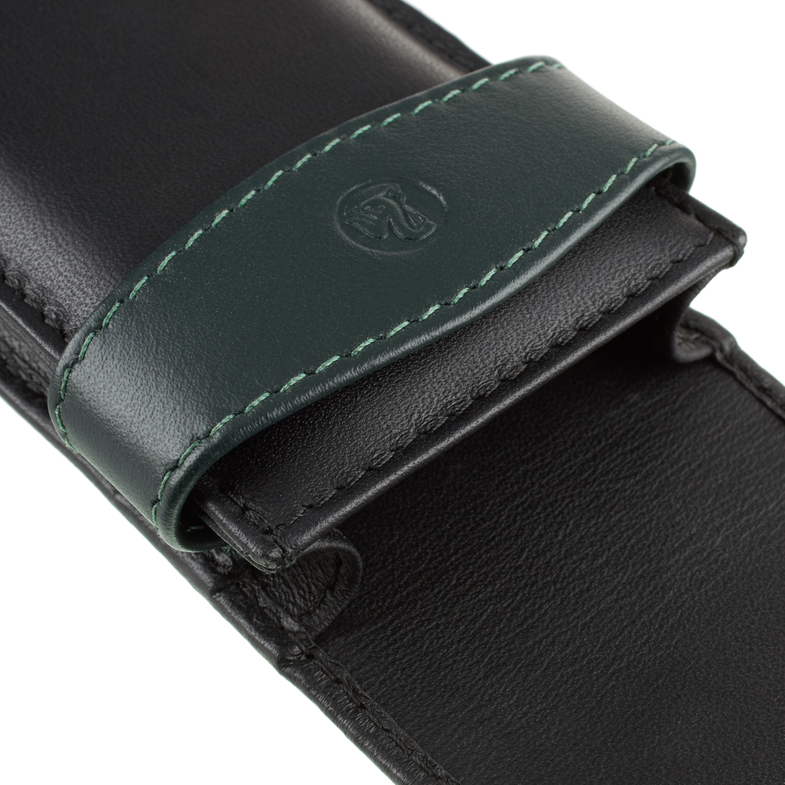 Классический кожаный чехол для трех ручек от немецкого бренда Pelikan является идеальным аксессуаром, дополняющим ваши ручки. Он отлично подходит для хранения трех пишущих инструментов стандартного размера, надежно защищая их от повреждений при ношении с собой. Чехол изготовлен из приятной на ощупь натуральной телячьей кожи черного цвета, а держатель замка исполнен в темно-зеленом цвете, придающем футляру оригинальность.