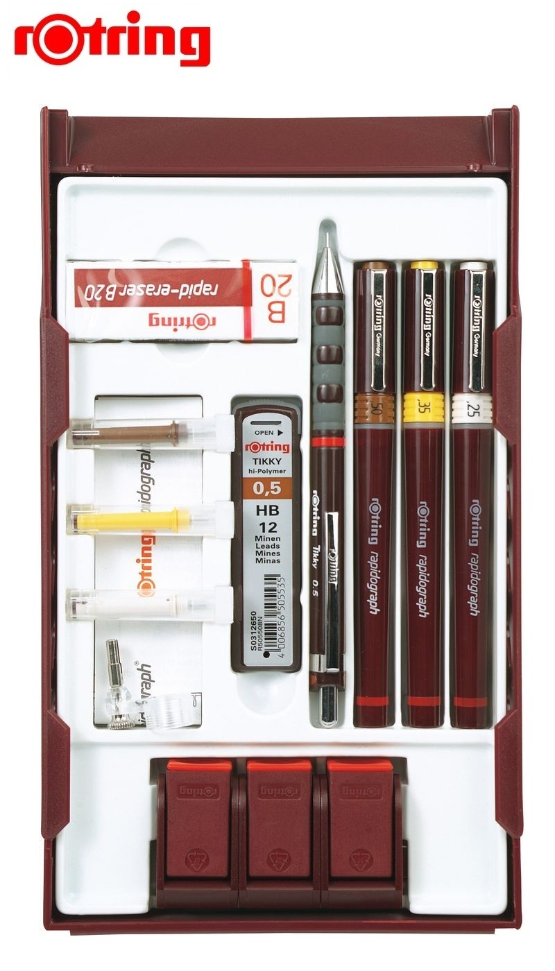 Рапидограф Rotring - чертежный прибор для черчения и рисования на бумаге, ватмане и чертежной пленке. Пишущий узел изготовлен из легированной упрочненной стали и устойчив к стиранию и механическим повреждениям. Уникальная система самоочистки и регулятор подачи туши обеспечивают долговечность и комфорт в работе. Герметичный колпачок предохраняет тушь от высыхания в течение двух месяцев.