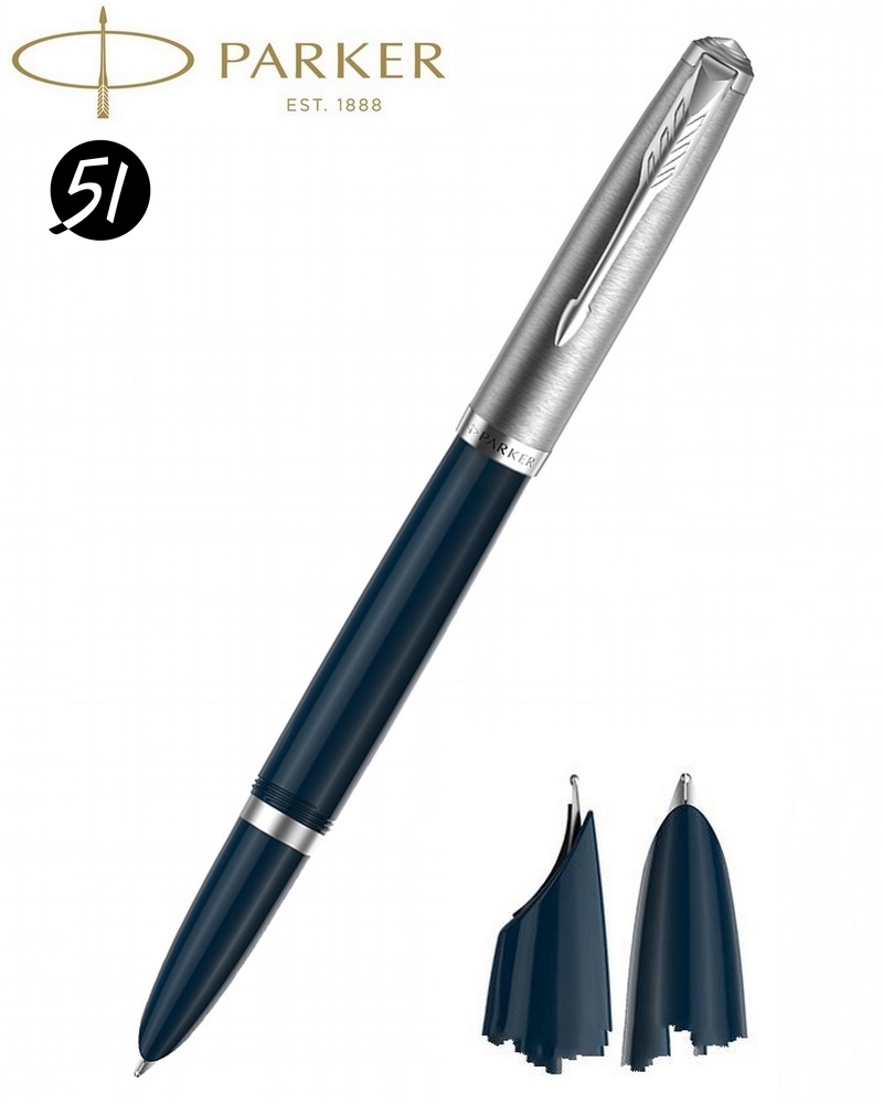 Перьевая ручка Parker 51 наполняется через картридж или конвертер и доступна с наконечником из нержавеющей стали Fine или Medium.
