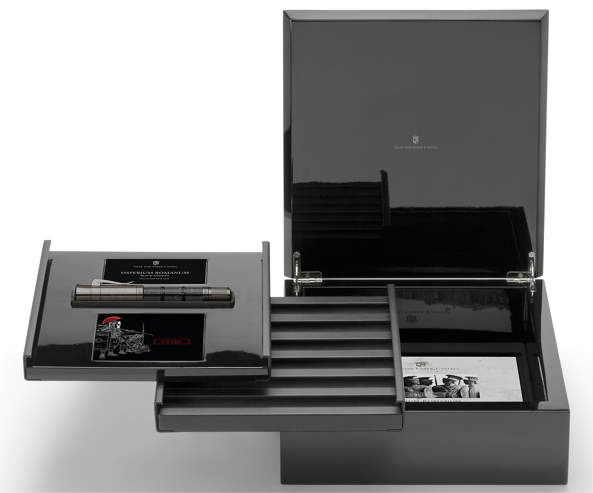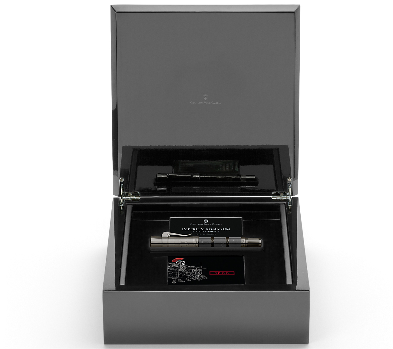 Серия "Pen of the Year" началась в 2003 году и заняла прочное место среди ценителей прекрасной письменной культуры. Эти эксклюзивные письменные принадлежности появляются в ограниченных изданиях и представляют необычные материалы, созданные вручную с большим мастерством. Каждая ручка года рассказывает историю эпохи и людей, чьи поступки произвели сильное впечатление на историю человечества. В этом году он сосредоточен на империи, которая, шаг за шагом с 8-го века до нашей эры, простирается на три континента: Европу, Африку и Азию. Даже сегодня, в начале третьего тысячелетия, она по-прежнему оказывает неизмеримое влияние на наш мир: Imperium Romanum. Ее великие правители, величественные здания и исторические достижения культуры продолжают очаровывать снова, и снова: они явились вдохновением для создания специального выпуска с Каррарским мрамором «Imperium Romanum» Pen of the Year 2018. Великолепие лимитированного черного издания состоит в завораживающем контрасте. В поисках подходящей противоположности белому мрамору Statuario была сделана удачная находка на Пиренейском полуострове, когда-то принадлежавшем Римской империи. Мрамор Nero Marquina (Неро Маркина) из региона Бискайя в стране Басков изысканно сочетает в себе основной черный цвет с ярко выраженными белыми прожилками. Он прекрасно гармонирует с антрацитово-серо-титановым PVD-покрытием, которое используется в отделке. Корпус ручки-роллера Graf von Faber-Castell Pen of the Year 2018 Imperium Romanum Black Edition украшен тремя сегментами черного мрамора, с двумя покрытыми PVD-покрытием кольцами, украшенными лавровыми венками, символизирующими славу и успех. Еще одной необычной деталью в этом издании является тщательно продуманный дизайн колпачка ручки. Колпачок «Black Edition» украшает гравюра знаменитого Колизея, а его торец - изображение миниатюрной римской монеты и гравировка в виде надписи "Graf von Faber-Castell". Денарий с изображением головы Цезаря на торце колпачка был выполнен по образцу очень редкой серебряной монеты 44 года до н. э., оригинал которой был найден в Дюссельдорфе, у престижного дилера и сертифицированного эксперта по монетам. Торец ручки украшает гравировка в виде логотипа бренда и надпись "Pen of the Year". Отдельные элементы дизайна - антрацитово-серо-титановое PVD-покрытие, которое идеально соответствует очень мужскому облику корпуса ручки. Поставляется ручка-роллер в уникальном полированном черном деревянном футляре с приложением красочной брошюры и свидетельства.
