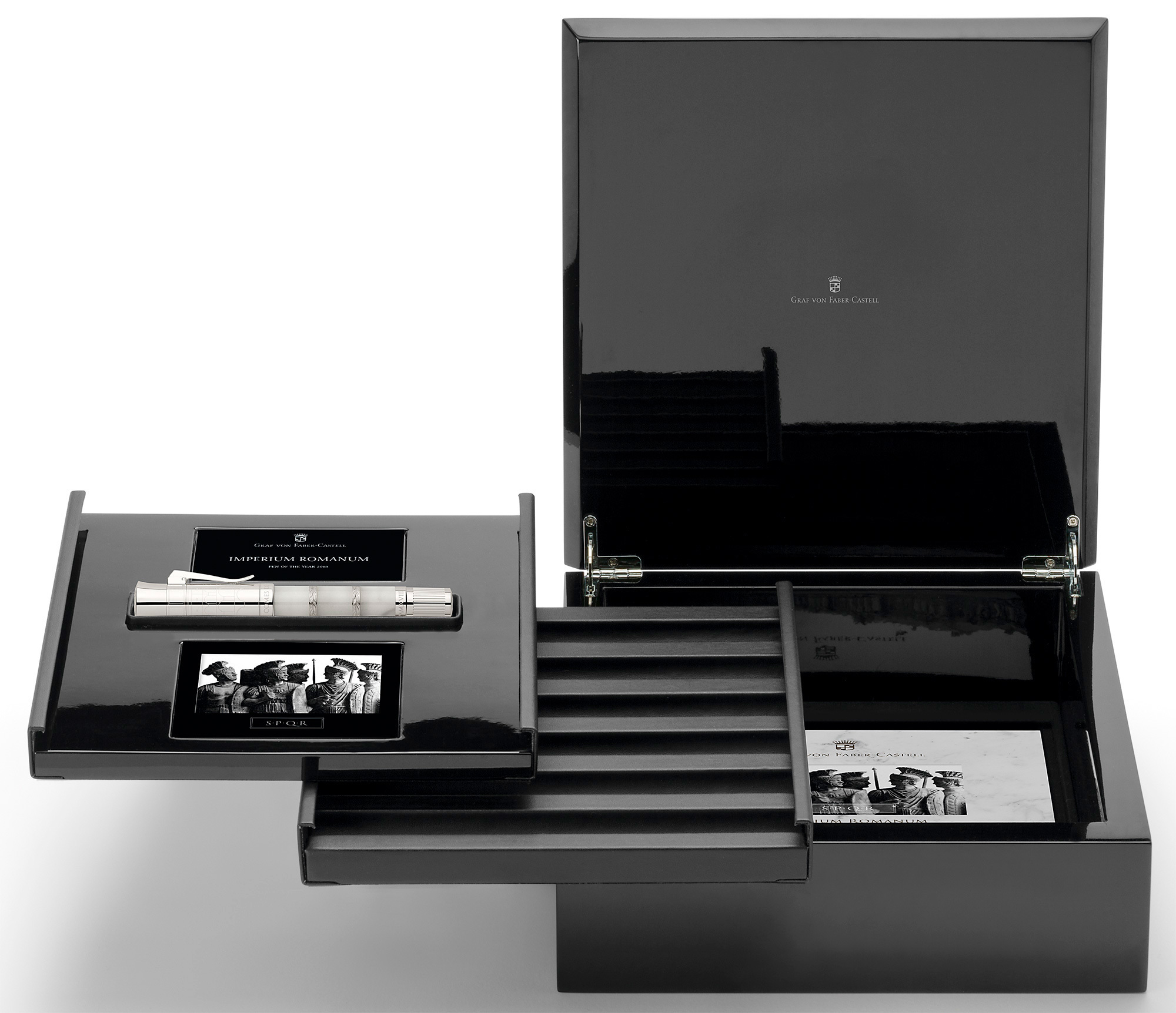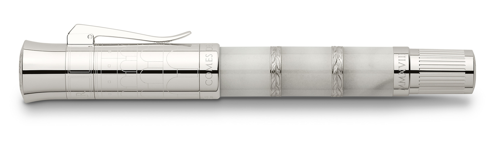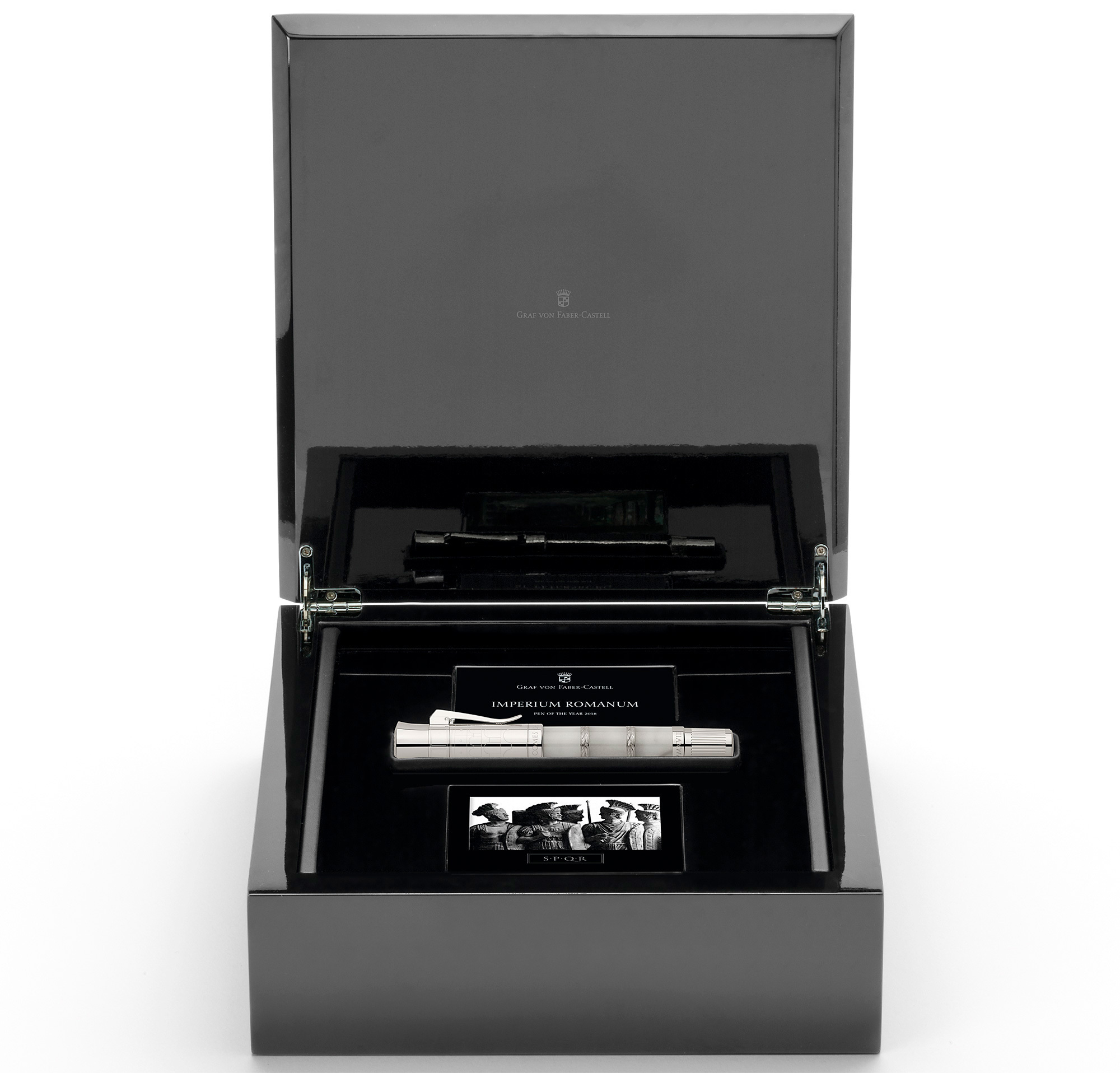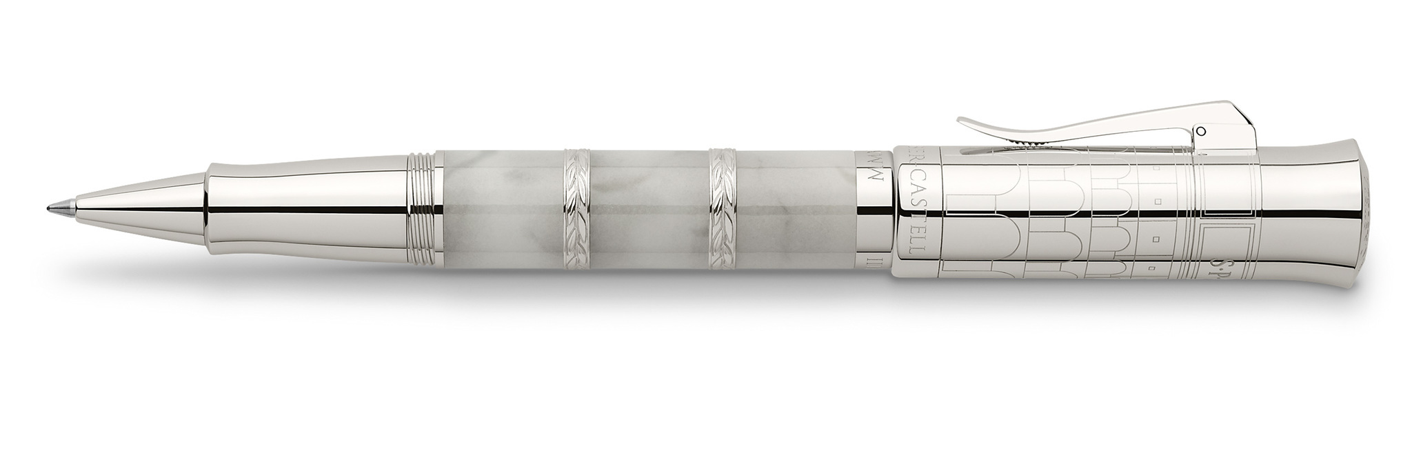 Серия "Pen of the Year" началась в 2003 году и заняла прочное место среди ценителей прекрасной письменной культуры. Эти эксклюзивные письменные принадлежности появляются в ограниченных изданиях и представляют необычные материалы, созданные вручную с большим мастерством. Каждая ручка года рассказывает историю эпохи и людей, чьи поступки произвели сильное впечатление на историю человечества. В этом году он сосредоточен на империи, которая, шаг за шагом с 8-го века до нашей эры, простирается на три континента: Европу, Африку и Азию. Даже сегодня, в начале третьего тысячелетия, она по-прежнему оказывает неизмеримое влияние на наш мир: Imperium Romanum. Великие правители, величественные здания и исторические достижения культуры Римской империи продолжают очаровывать снова, и снова: они являются вдохновением для создания платинового специального выпуска с Каррарским мрамором «Imperium Romanum» Pen of the Year 2018. Уникальная аура окружает мрамор "statuario" из Каррары. Микеланджело использовал этот чрезвычайно мелкозернистый блестящий белый камень для создания своего монументального Давида, вероятно, самой известной статуи в истории искусства. Statuario считается одним из ценнейших сортов мрамора. Для «Imperium Romanum» Pen of the Year 2018 был выбран именно этот сорт мрамора. Корпус ручки-роллера Graf von Faber-Castell Pen of the Year 2018 Imperium Romanum Platinum покрыт платиной и украшен тремя сегментами мрамора staturario. Кольца между мраморными сегментами покрыты платиной и украшены лавровыми венками, символизирующими славу и успех, и придают ручке свою неповторимую элегантность. Еще одной необычной деталью в этом издании является тщательно продуманный дизайн колпачка ручки. Колпачок украшает гравюра знаменитого Колизея, а его торец - изображение миниатюрной римской монеты и гравировка в виде надписи "Graf von Faber-Castell". Денарий с изображением головы Цезаря на торце колпачка был выполнен по образцу очень редкой серебряной монеты 44 года до н. э., оригинал которой был найден в Дюссельдорфе, у престижного дилера и сертифицированного эксперта по монетам. Отдельные элементы дизайна - платиновое покрытие. Торец ручки украшает гравировка в виде логотипа бренда и надпись "Pen of the Year". Поставляется в уникальном деревянном футляре с приложением красочной брошюры и свидетельства.